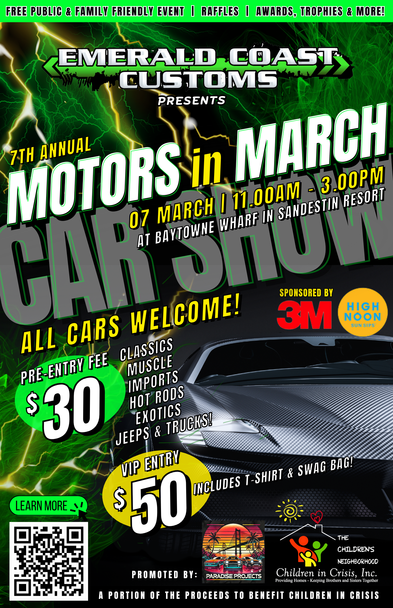 By joining the community at Motors in March, Emerald Coast Customs is honored to help raise funds and awareness for this important mission. Every vehicle entry, sponsorship, and donation contributes to real, positive change for local families.
